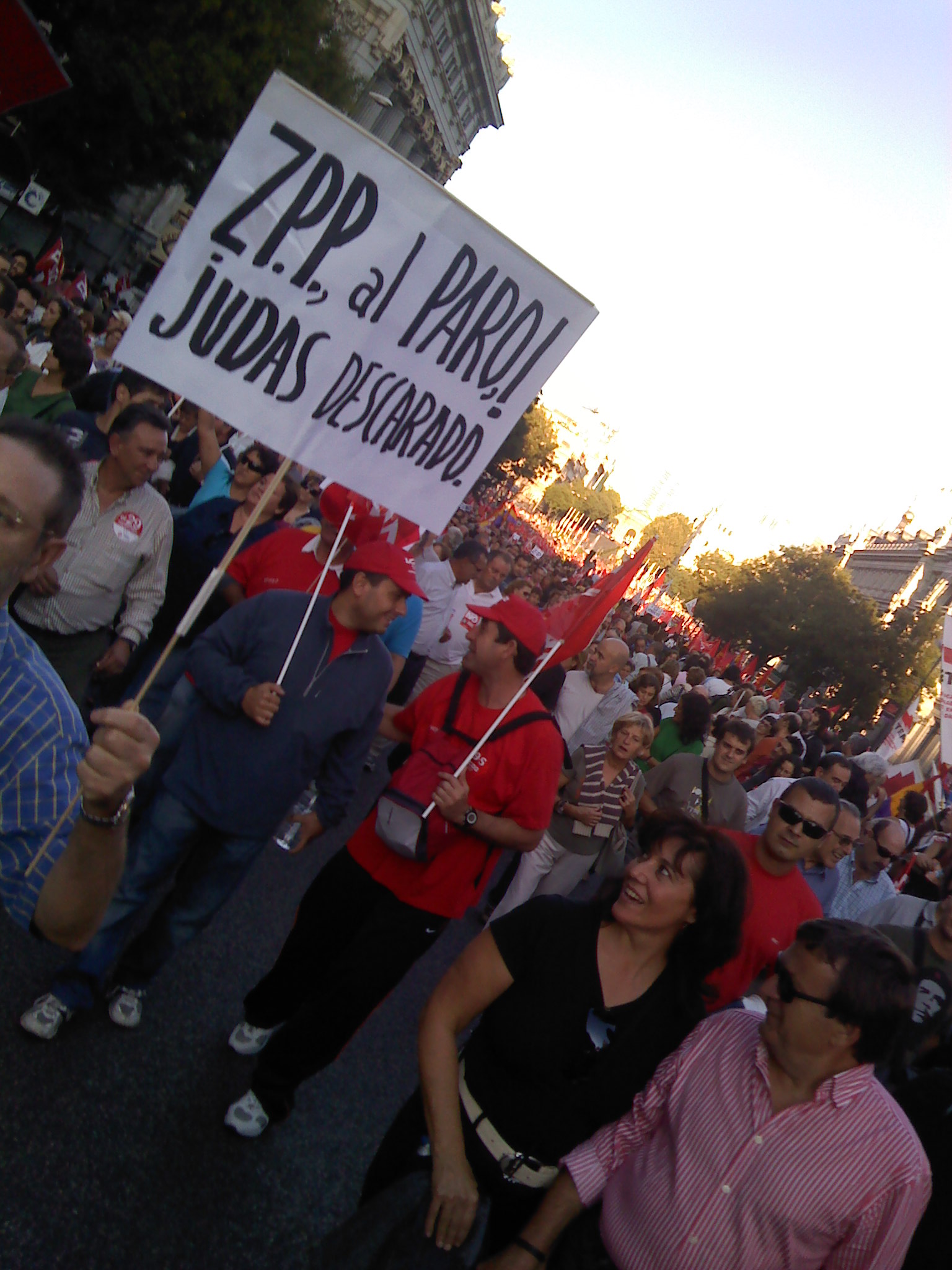 Las manifestaciones mostraron en las calles españolas carteles (los más pequeños y elaborados con menos recursos) que llamaban, ingenuamente, “¡Traidor!” a Zapatero. Decimos ingenuamente porque Zapatero no es un traidor, si acaso sí es un trilero político, un mentiroso compulsivo y un embaucador, pero que jamás ha renunciado a sus ideas delirantes, pero profundamente antisocialistas para España: Zapatero es el exponente máximo en el presente de una socialdemocracia progresista no marxista que no duda en coger un martillo de juguete para aporrear al “capital” mientras con la otra pacta con él reformas laborales y administrativas que desunen a España y ahondan en las desigualdades sociales entre los españoles. Mientras las bases sindicales gritaban “¡Zapatero, Dimisión!” (un grito que empezó a oírse entre los populares españoles ya en el 2004, pero que ya no es sólo patrimonio suyo), las cúpulas (Toxo y Méndez entre otros), encabezaban las marchas con un patético lema: “Así no, rectificación ya”.